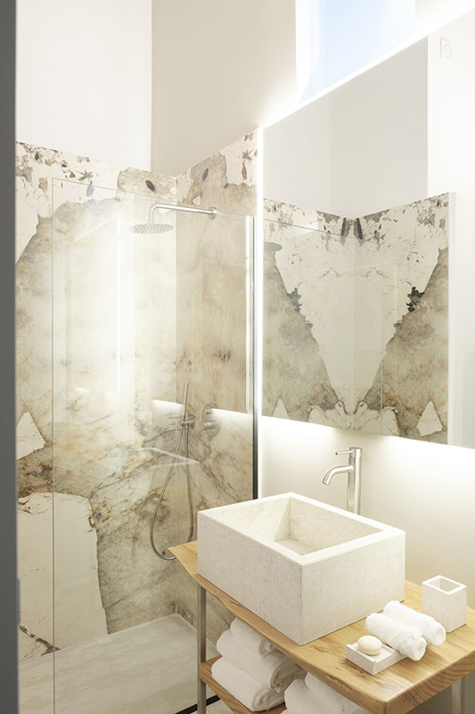 Questo ambiente esclusivo è arricchito da un pavimento realizzato con una preziosa pietra, che conferisce un tocco di eleganza e raffinatezza. Le pareti dalle tonalità tenui creano un’atmosfera avvolgente e serena. Il letto king size con materasso di ultima generazione dona un sonno riposante e rigenerante.